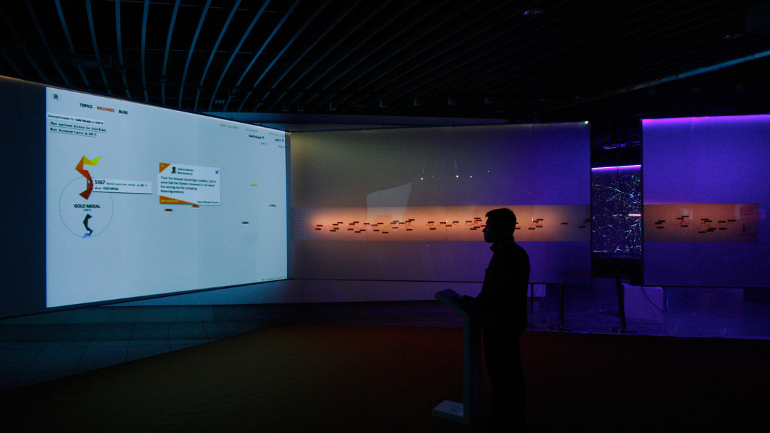 In many ways the crowning piece of the project, and a conceptual counterpoint to the ephemeral web activities, our data sculpture preserved the more than 12 million tweets in physical form. We had 17 plates CNC-milled — one for each day of the games — with a relief heatmap indicating the emotional highs and lows of each day. Overlay projections highlighted individual stories, and visitors could scroll through the most retweeted tweets per hour for each story using a control knob.