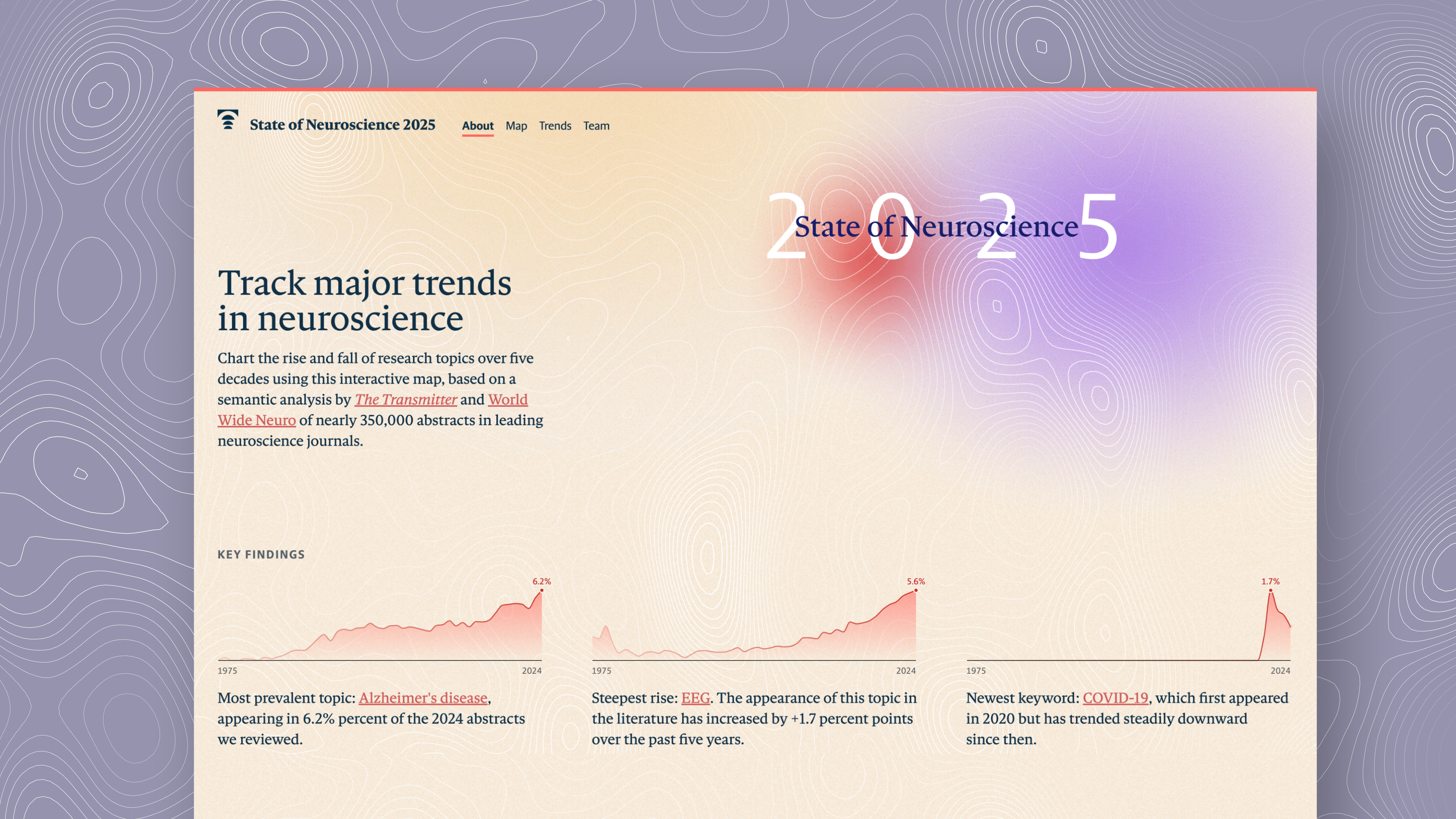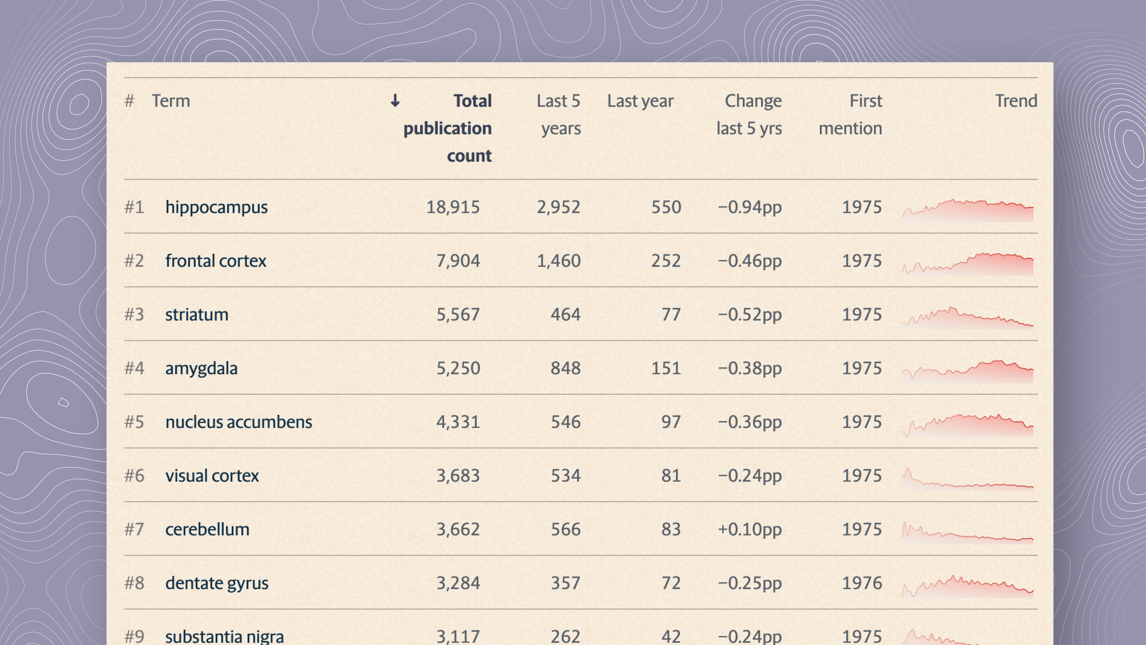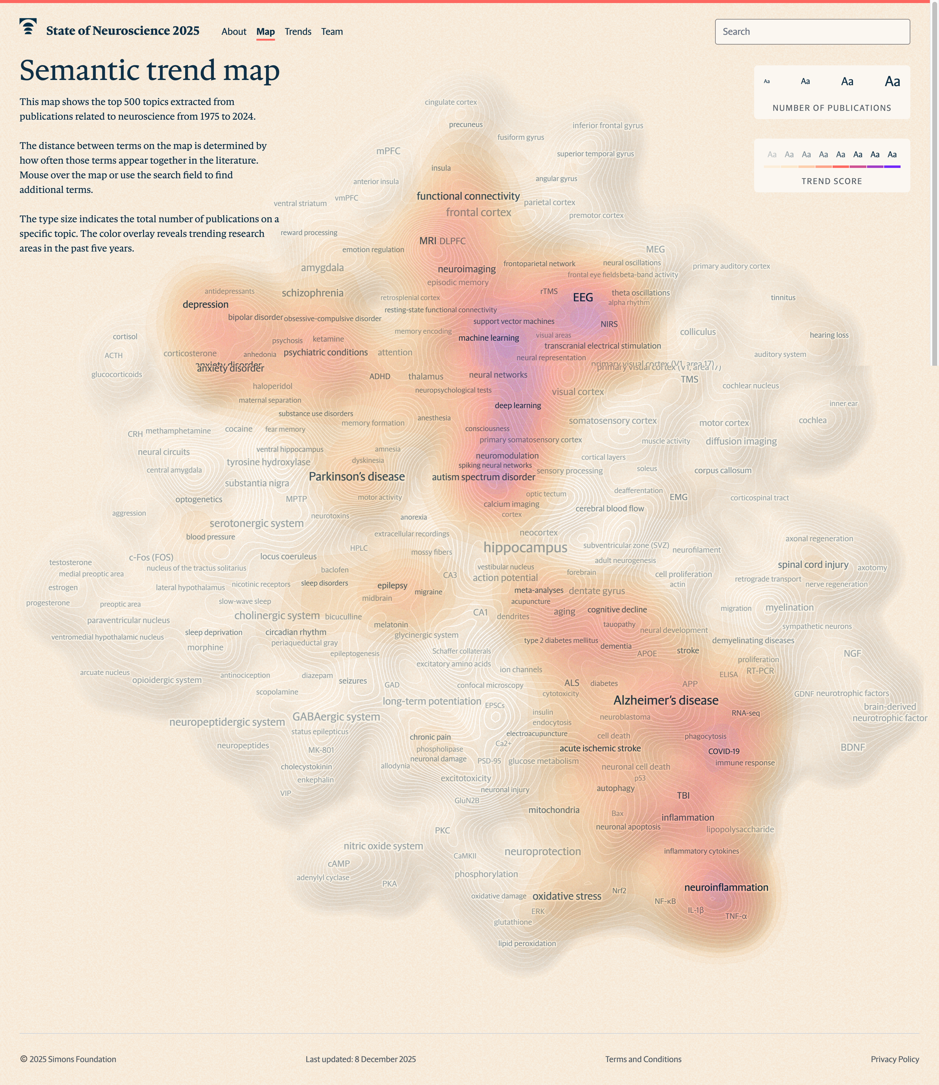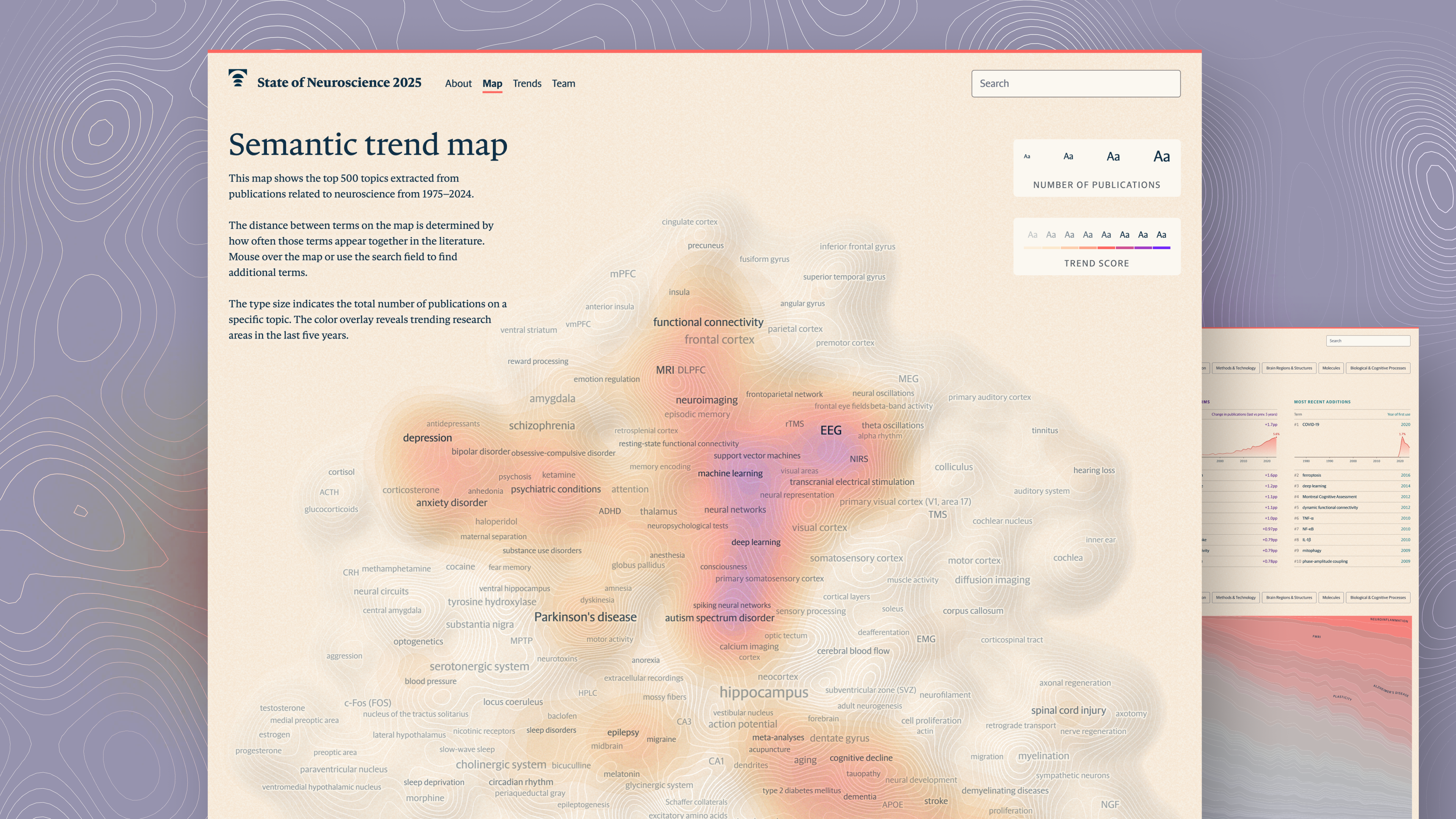 This visual puts 50 years of neuroscience research on the map — by analyzing nearly 350’000 research publications and extracting salient keywords. Based on this, we were able to map the semantic concept space of neuroscience research: how are topic related to each other — and where is the current focus of attention?